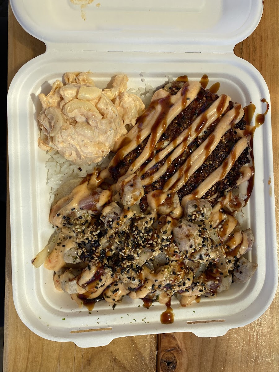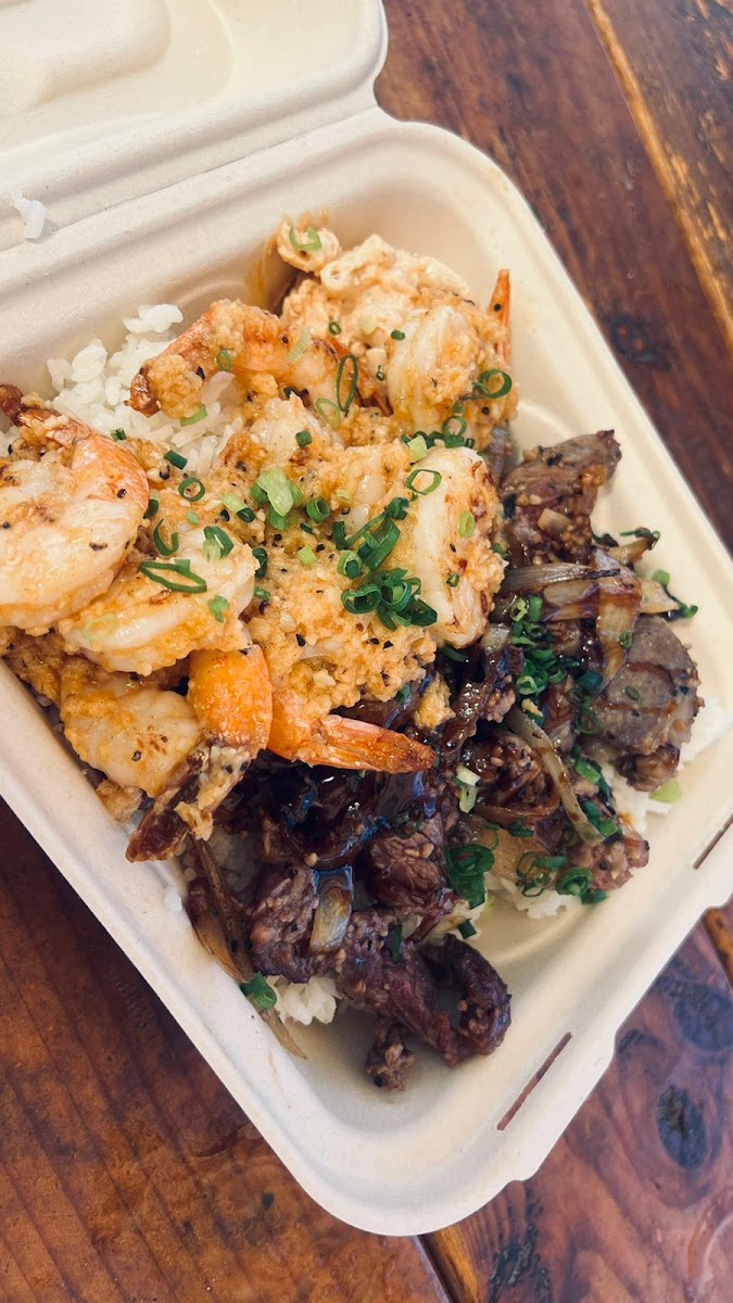 The menu showcases a lineup of combo plates that bring together classics like boneless kalbi short ribs marinated in Korean-style sauce, furikake fish, and variations of garlic butter shrimp. Portions tend to be generous, which appeals to groups looking to share and sample different dishes, such as the popular kalbi and furikake crusted salmon combo or the creamy pan-fried poke. Breakfast options offer a local take as well, featuring Portuguese sausage, longanisa sausage, and Spam paired with eggs and rice, suitable for grabbing a filling start to the day.