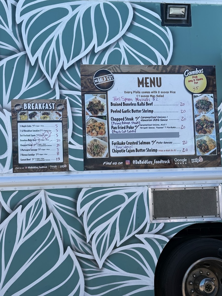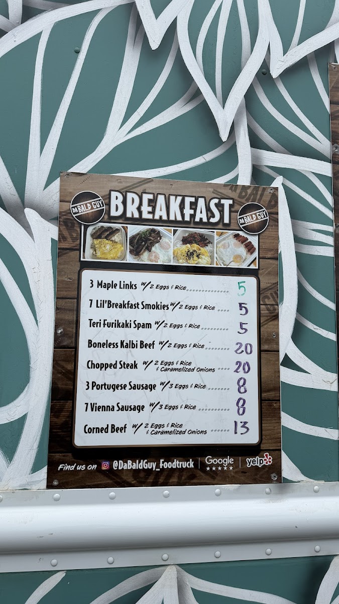 Breakfast items feature a selection of local staples such as Portuguese sausage, teri furikake spam, smokies, eggs paired with various meats including boneless kalbi and chopped rib eye steak, and corned beef.