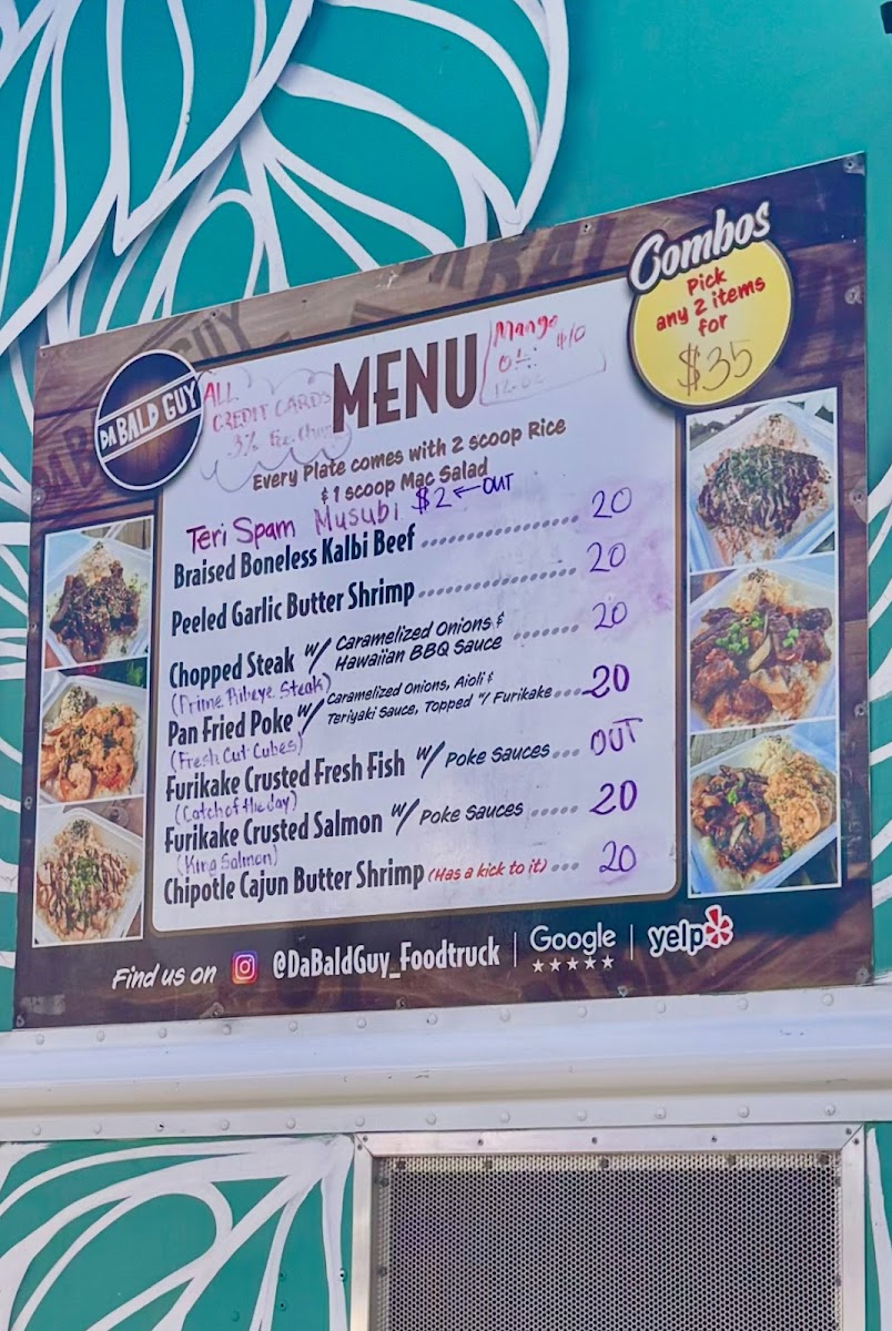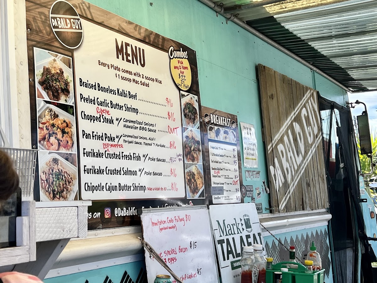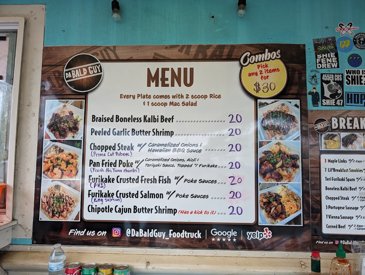 The menu offers a variety of Hawaiian BBQ-inspired dishes, including seafood, steak, and traditional local plate options. It is organized into several key groups to accommodate different meal preferences and times of day.